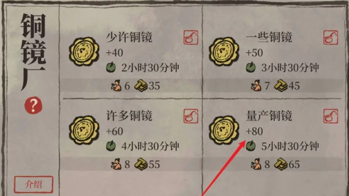 建造铜镜厂要求玩家角色等级达到75级,之后可在营造菜单中选择并安置这一建筑。铜镜厂支持多次升级,每级提升都会减少生产时间并可能调整资源需求,满级时所有生产时间减少30%,这显著提高了铜镜的获取速度。玩家需要平衡升级成本和收益,以确保铜镜生产与整体城镇发展同步进行。