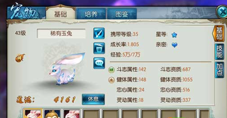 成功捕获稀有玉兔后,它是一只等级要求为35级便可携带的宠物。它的主属性偏向于健体,辅属性为斗志,因此在技能搭配上比较适合向防御系方向发展。作为稀有宠物,它的外观与普通宠物不同,成长值和资质下限也更高,并且初始就拥有两个技能,后续通过培养可以达到更高的上限,是一只值得投入资源进行长期培养的伙伴。