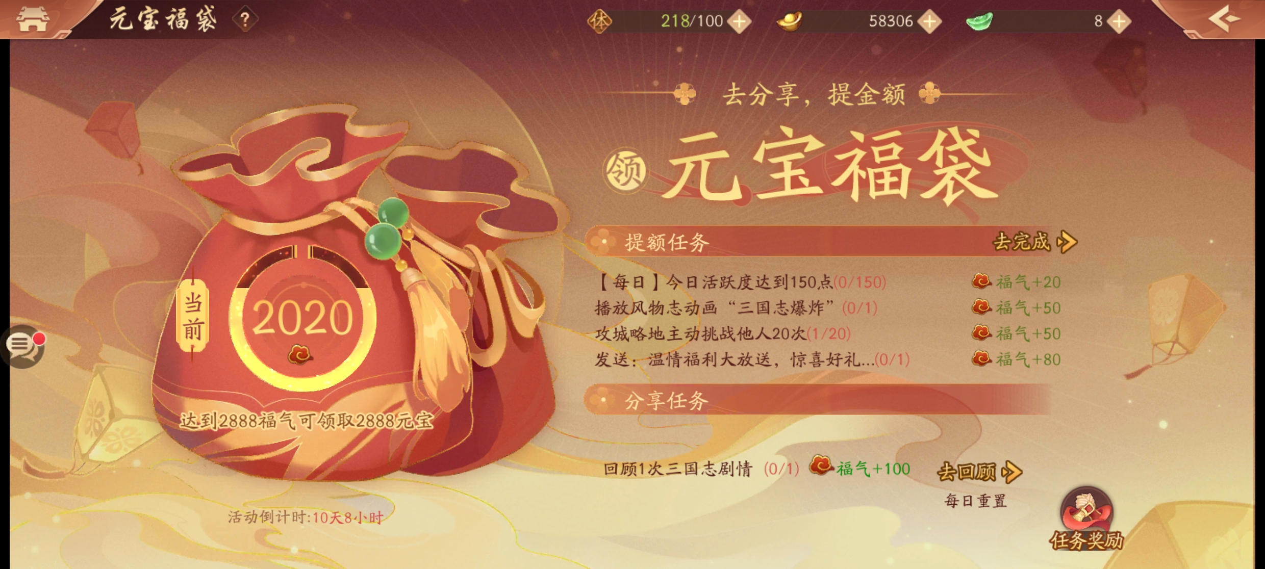 打开后能获得元宝、神兵碎片、武将碎片等豪华奖励。想拿到它,主要有两种方式:参与特定限时活动和完成日常任务。活动期间登录游戏就能领取初始福袋,里面包含基础福气值,通过积累福气值就能兑换丰厚奖励。这类活动通常持续几天,记得每天上线操作,否则错过截止日期奖励是不会补发的。除了常规获取,部分节日活动如春节、周年庆也会直接赠送福袋,所以要多关注游戏公告。