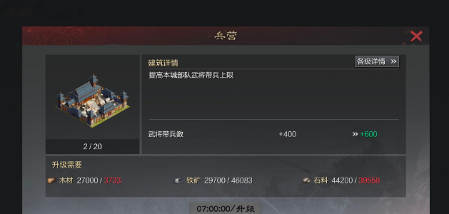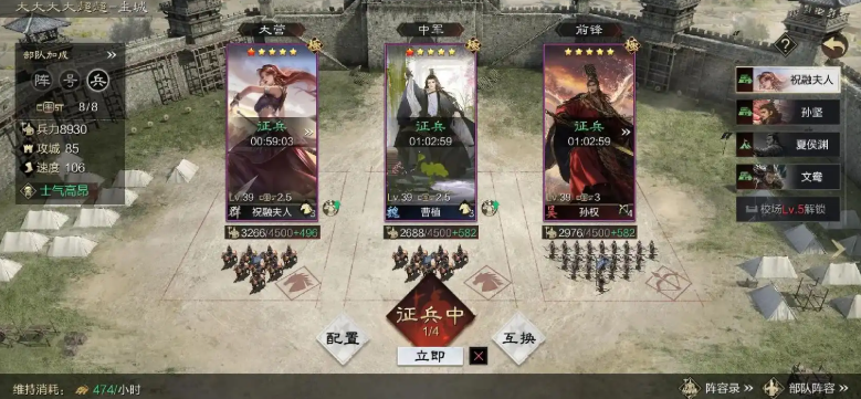 每一次募兵都会消耗大量粮食、木材、铁矿等资源,因此保证资源产出的稳定与富余至关重要。你需要合理规划城内资源建筑的升级,并积极占领更高级的土地来提升产量。避免在征兵时一次性耗尽所有库存,保留一部分资源以应对紧急补兵或其他关键建筑的升级需求,这样才能实现可持续的兵力生产。