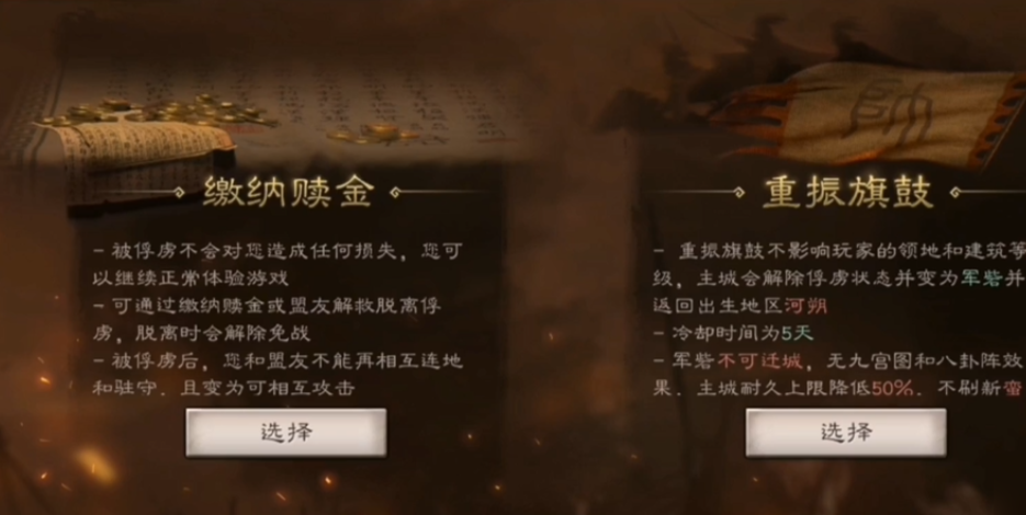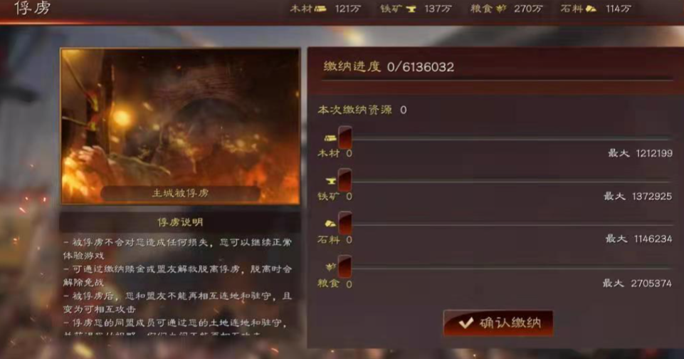脱离俘虏依赖资源缴纳或盟友救援,被俘玩家可消耗粮食铁矿等资源逐步赎回自由,赎金数额与势力值挂钩,盟友救援需集结5000兵力攻破俘虏主城,优先选择高士气时段进攻提升成功率,主城解俘后分城自动释放,紧急撤离功能可将主城迁回出生州,但会损失20%资源并清除所有领地,仅建议极端情况下使用。