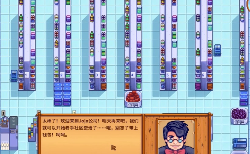 成为会员后,游戏进程将转变为逐一购买并完成Joja社区发展申请书。这些申请书对应着修复矿车、公车、桥梁、温室等各项社区设施,每个项目都有明确的标价,玩家一天只能购买一项。例如修复公交车需要支付四万金币,解锁温室需要三万五千金币。玩家需要持续高效地经营农场、采矿或从事其他生产活动来积累财富,以支付这一系列高昂的费用。当所有发展项目购买完毕后,小镇会举行庆祝活动,玩家会获得一个汽水机作为最终奖励。