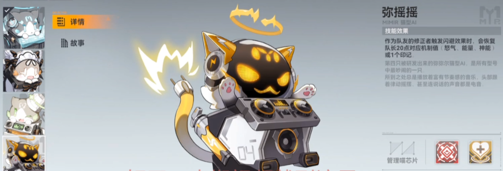 弥摇摇是一只泛用性很高的辅助型管理喵。它的效果是当作为队友的修正者触发闪避技能时,能为队长回复一定量的对应机制值或印记。这项能力对于依赖机制值或印记进行爆发输出的队长角色来说是个极大的助力,能有效加快其核心技能的循环速度,让整个队伍的作战节奏变得更加流畅。尤其在队长为震离·月读或特定流派的冰渊·波塞冬这类角色时,弥摇摇提供的机制值支持能让他们更快地进入高伤害状态。