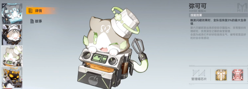 如果队伍的生存压力较大,或者采用了无奶妈的强力输出阵容,那么弥可可是一个非常可靠的选择。这只喵的效果是,任何队员触发闪避技能时,都能立刻为全队恢复一定比例的最大生命值。这个效果由AI队友触发时也能生效,在长时间的战斗中能积累可观的回复量,相当于为队伍提供了一个稳定的后台续航。它适合那些输出足够但缺乏回复手段的阵容,或是应对一些存在持续伤害环境的关卡,能显著提高全队的持续作战能力。