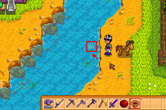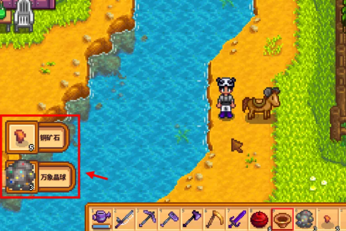 铜锅的核心功能是用于在淡水水域中淘取矿石。使用前,玩家需要将铜锅从背包中取出并放置于物品栏中选中,使其处于准备使用的状态。可进行淘金的地点包括游戏内的河流、湖泊、水塘等所有淡水区域,但海边海水区域无法使用。操作的关键在于观察水面变化,当水面出现闪烁的白色光点、类似冒热气的纹路或移动的泡泡,并伴随有特殊的水流声时,即表示该处水下藏有矿石。玩家只需用鼠标点击选中水面上的闪光点,角色便会自动进行淘金动作,成功后矿石将自动进入背包。有时可能需要多次点击才能成功触发淘金。