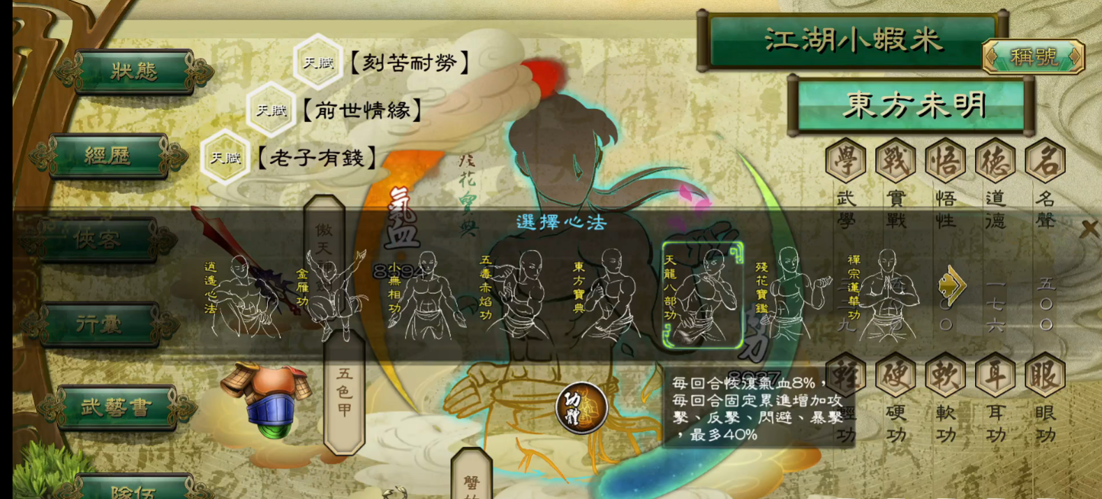 内功的获取方式多样,包括拜师学艺、完成任务、探索隐藏地点以及购买特殊商品等。逍遥心法是最基础的内功,拜师后由师傅直接传授,效果为每回合恢复5%气血与10%内力。金雁功则需在洛阳江府拜寿时通过郊外徐子骐传授,能提升闪避和移动能力。商店在特定时间会出售东方宝典等内功秘籍,需注意购买时机。