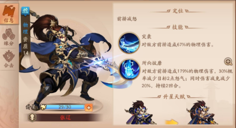 幻紫后的张辽属性获得全面提升,技能机制产生质变。其被动技能强化了额外命中率与暴击率,普攻及怒气技能可对目标及相邻单位造成多段伤害,当敌方生命值高于50%时伤害进一步增加。必杀技释放后触发神速状态,清除自身减益效果并获得疾风状态提供闪避能力,确保在战场上的生存与持续输出。这类特性使其定位为高爆发突击型武将,尤其擅长残局收割。
