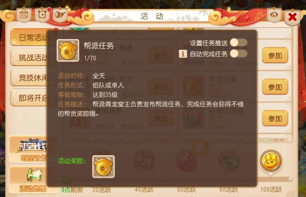 日常活动和限时玩法是帮派活力的关键。每周70次帮派任务一定要做完,像巡逻、挑战门首席、找NPC这些简单任务,给的经验、银币和帮贡都很实在。每周日的秘境活动是重头戏,组队冲上10层拿宝箱奖励,里面有五宝和兽决这类好东西,途中挂机还能蹭经验。周五的帮战考验战术配合,集中火力点杀敌方关键单位,及时替补队员才能走得更远。平时中午还可能刷出强盗入侵,组队清掉能为帮派添砖加瓦,自己也能分到银币。偶尔遇到的美食活动或百草谷任务也别错过,搜集食材炼丹换帮贡特别划算。