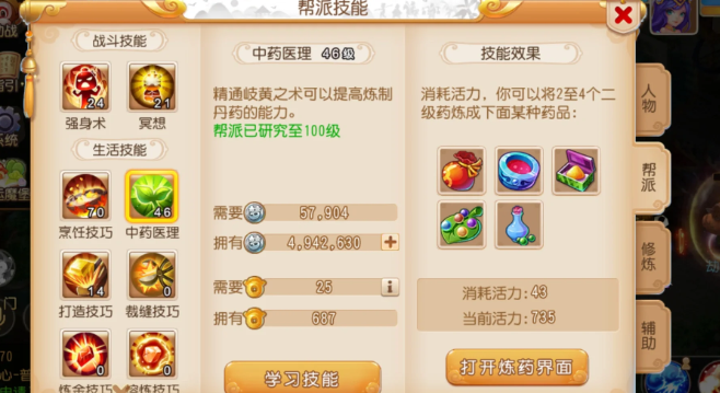 挣帮贡主要靠勤快做任务、打秘境或者参加百草谷,玄武堂每周还能用银两换300点。这些辛苦攒的帮贡千万别乱花,优先点修炼最要紧——攻修、法防这些加成对战斗影响巨大。帮派技能里强身、冥思必学,生活技能选炼药或烹饪也能补贴日常开销。记得看看修炼上限,它和帮派等级挂钩,所以督促帮里升级聚义厅对每个人都有好处。技能学到40级后会消耗帮贡,提前规划好方向避免浪费。