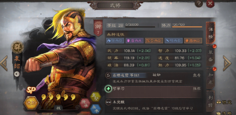兵种方面袁绍弓兵S,盾兵A,这让他适配性还行,但弓兵队通常偏脆,需要强力辅助,速度上袁绍不算快,容易被先手控制。游戏中后期敌人战法越来越强,袁绍如果没有红度或者高级战法支持,更难带动队伍,有些玩家尝试SP袁绍,但强度也一般,技能增伤和缴械效果有限,不如普通袁绍当主将实在。袁绍的累世立名战法虽然有灼烧效果,但和风助火势等联动需要精准触发,操作复杂,新手往往把握不好,这些因素叠加让他带不动的情况更常见。