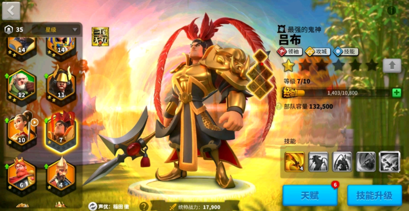 通用金色雕像的收集需要长期投入,例如通过完成远征任务、参与联盟战或节日限定活动来逐步积累。对于资源有限的玩家,聚焦于每日任务和联盟合作能更高效地获取资源,避免因分散培养而延迟觉醒进度。觉醒后吕布的技能会显著增强,主动技能方天戟的伤害系数从800提升至1000,防御降低效果也从40%提高到50%,显著增强他在团战中的影响力和持续输出能力。这种变化使得他在面对多个目标时更具破坏性,能为团队创造更多优势。