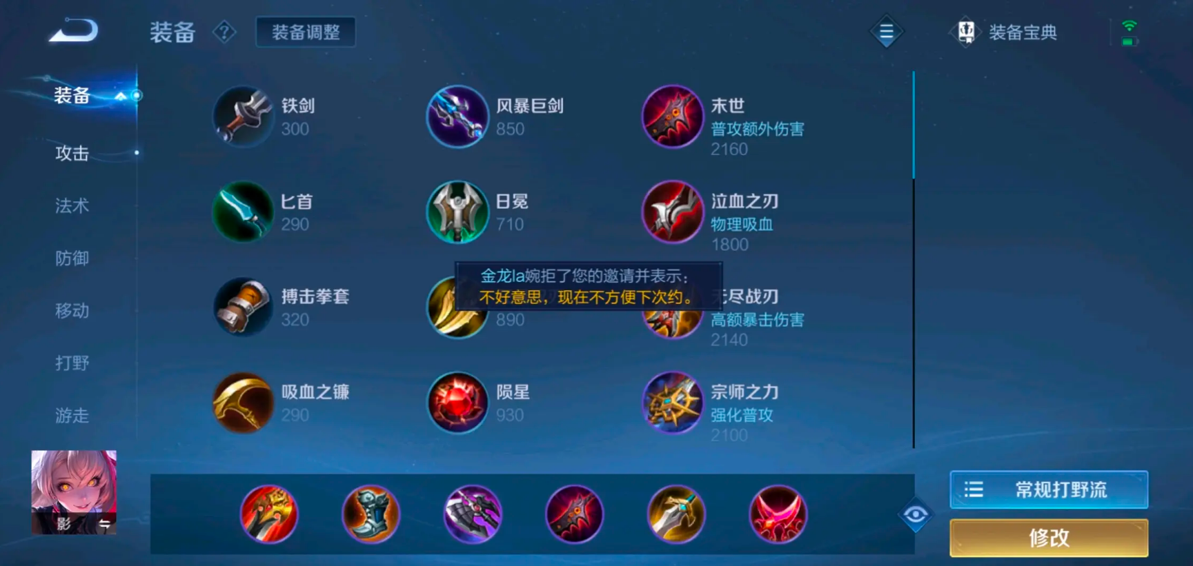 影在打野位上可以选择暴击流出装方案,这套出装的核心思路是通过高攻速和暴击属性快速清野并打出爆发伤害。出装顺序建议从追击刀锋开始,提供打野效率与攻速加成,接着出急速战靴提升前期机动性。影刃和无尽战刃构成暴击组合,能显著提升输出能力,接着补充泣血之刃增强续航,最后用破晓应对坦克英雄。追击刀锋的被动叠加攻速可以让影更快触发技能效果,实现持续的高额伤害输出。