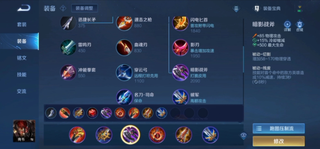 抵抗之靴为典韦提供韧性和魔法抗性减少被控制的时间,反伤刺甲则增强物理防御并反弹伤害,暗影战斧提供冷却缩减和物理穿透,宗师之力提升普通攻击伤害,魔女斗篷增加法术防御,名刀司命则在关键时刻提供保命能力。对于打野位置,追击刀锋或巡守利斧是常见选择,能加快清野速度,而边路出装可能更侧重于红莲斗篷或暴烈之甲来提升清线和抗压能力。