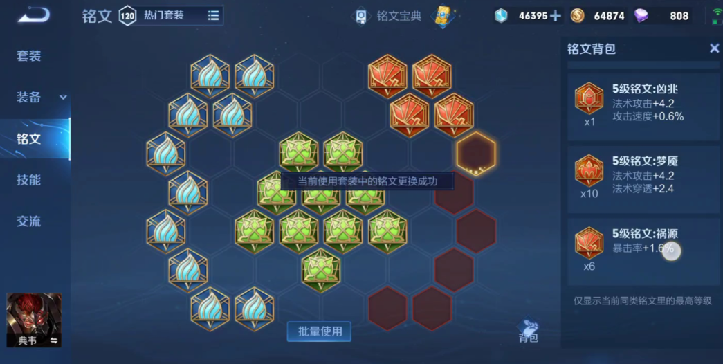 鹰眼铭文提供稳定的物理穿透增强典韦的前期伤害输出;隐匿铭文增加移动速度,弥补他机动性不足的缺点;祸源和无双的混合搭配平衡了暴击率和暴击效果,使他在中后期拥有更高的爆发潜力。如果侧重于生存,可以考虑将部分祸源替换为宿命铭文,但会略微降低伤害上限,这种组合能帮助典韦在四级后快速叠加被动层数,提升单杀能力。