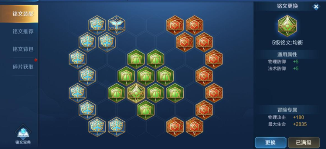铭文方面推荐10宿命、10调和、10虚空的经典坦克组合,这套配置提供大量生命值、物理防御和冷却缩减,强化盾山前期的基础属性,使其在游走支援时能更频繁使用二技能开团。由于盾山的被动普攻附带最大生命值百分比的物理伤害,血量加成的收益远高于双抗属性,因此铭文选择以提升生命值和回复效果为主,红色宿命增加生命和防御,蓝色调和提供生命回复和移速,绿色虚空则贡献冷却缩减和生命值,这样的搭配能有效提升盾山的持续作战能力和控制频率。