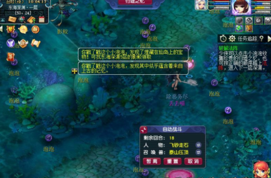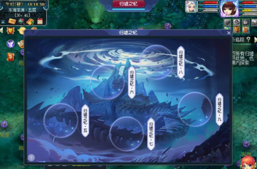玩家需要点击散布的泡泡来触发各种随机事件,事件类型包括获得未解锁的记忆碎片、被混沌之息侵蚀损失气血、随机传送至本层其他位置、遭遇战斗、变身泡泡造型或直接获得宝物奖励,变身泡泡后若触碰障碍物会陷入短暂眩晕状态,而由于事件或战斗导致气血归零时,玩家会被强制传送回第一层重新开始探索。