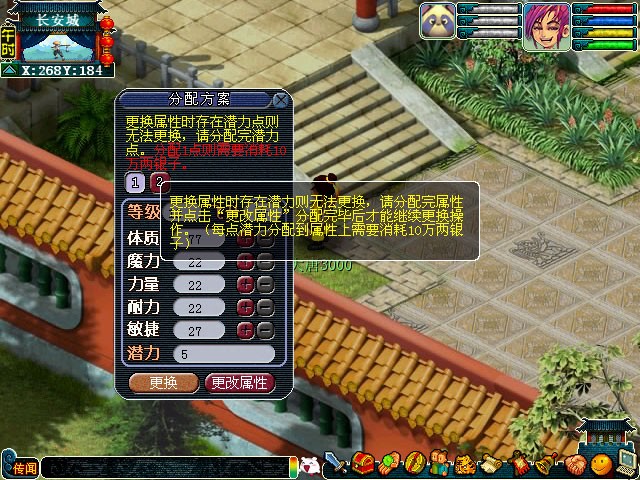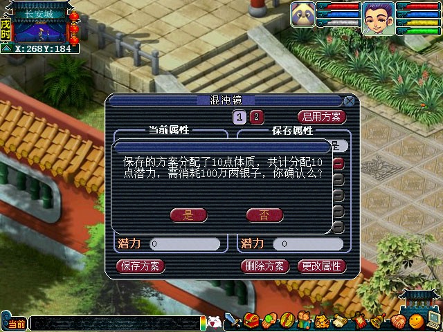 不过在使用这个方便的功能时,有几个细节必须要注意,不然可能会让你无法切换或者浪费钱。最重要的一点是,你保存在云游仙人混沌镜里的那套方案,必须是干干净净的,也就是说属性点要全部分配完,不能留有一点没加的潜力点。如果你保存方案后人物又升级了,系统会给这套保存的方案也增加潜力点,这时候你必须先去云游仙人那里,把这些潜力点分配掉,每分配一点潜力需要5万两银子。只有把潜力点都加完了,这套方案才能被用于切换。分配这些潜力点时,系统会跳出二次确认弹窗,你一定要看清楚再加,加错了就麻烦了。