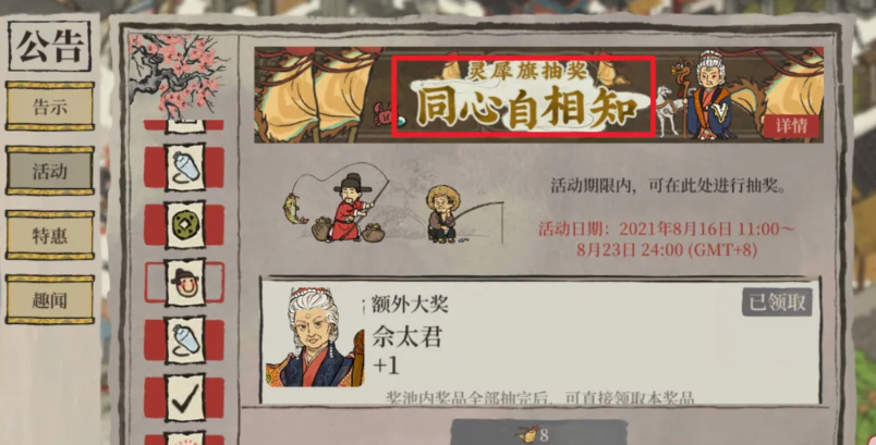 获得佘太君,你需要关注游戏内的限时活动。获取她的主要途径是通过特定的活动抽奖。你需要进入游戏,点击查看公告按钮,然后在公告页面找到活动入口。参与名为同心自相知或类似主题的灵犀旗抽奖活动,在活动期间清空整个奖池,就可以直接领取佘太君这位角色了。这个方式比较直接,但需要准备好相应的抽奖资源,活动时间通常有限,记得及时参与。