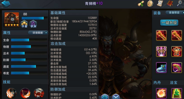 青狮精在游戏中定位为兼具生存与爆发能力的物理输出型战士,尤其擅长克制法师阵容。其核心优势在于一技能可显著削弱敌方法术强度,大招具备高额伤害与吸血续航效果,配合击飞控制技能,在对抗法系阵容时表现突出。培养方向需围绕强化物理输出、优化技能循环及提升战场生存能力展开,同时根据PVE闯关、篝火或PVP等不同场景灵活调整策略。