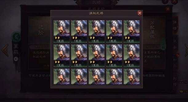 武将进阶是提升武将实力的核心机制,它通过消耗同名武将卡来实现,每次操作都能为武将增加10点自由属性点,五星武将最多可进阶五次,总计获得50点额外属性,这直接带来武将整体属性的显著提升,在战斗中影响输出、防御等关键能力。进阶不仅优化了武将的基础面板,还改变了星级标识,从初始黄色勾玉逐步变为红色,当红星全满时代表最高进阶阶段,这种视觉变化直观反映武将的成长进度,帮助玩家快速辨识队伍强度。对于玩家来说,进阶是资源投入的重点方向,尤其在培养主力武将时,它避免了浪费其他稀有材料,专注于同名卡的积累即可持续强化战力。