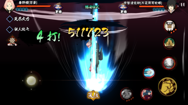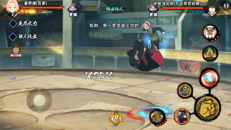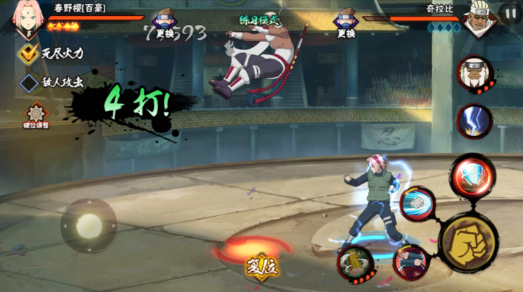 觉醒后长按一技能樱花抱可触发抱摔动作。小樱会抓住敌人进行旋转投掷,将其甩向战场边缘。若敌人在飞行过程中碰撞到版边,将触发反弹效果落回场内。此过程全程为抓取判定,对霸体状态的目标同样生效,是百豪樱对抗霸体忍者的关键手段。普通状态下的樱花抱仅有基础抓取和砸地效果,无法触发甩飞机制。
