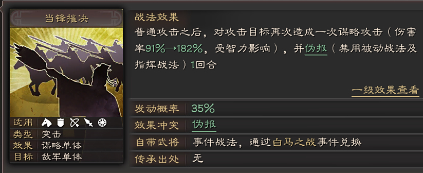 战法配置需围绕保生存、稳控制、渐输出原则展开。刘备作为核心辅助,必备陷阵营提供群体治疗及武力加成,第二战法优先选择暂避其锋或御敌屏障,通过高额减伤保护关羽、张飞免受爆发威胁。关羽推荐忠勇义烈配合掣刀斫敌,前者提升主动战法发动率及属性,后者补充输出及溃逃状态;若无掣刀斫敌可用疾风骤雨替代。张飞侧重控制链构建,威谋糜亢的虚弱效果可有效遏制敌方核心输出,草船借箭则提供群体净化与急救能力;箕形阵亦为优质选项,能针对性压制敌方主将爆发。