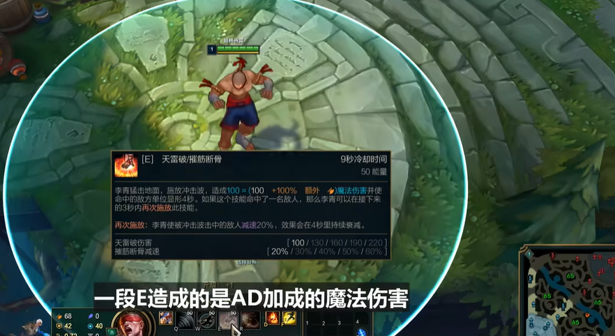 W技能金钟罩提供关键位移能力,冲向指定位置后若附近有敌方单位,可生成护盾吸收伤害增强生存;后续铁布衫强化普通攻击,附带额外魔法伤害和吸血效果,辅助盲僧在激战中维持状态。E技能天雷破施放冲击波伤害周围敌人并显露目标,命中后激活摧筋断骨减速敌人移动速度,有效控制战场节奏和限制对手行动。