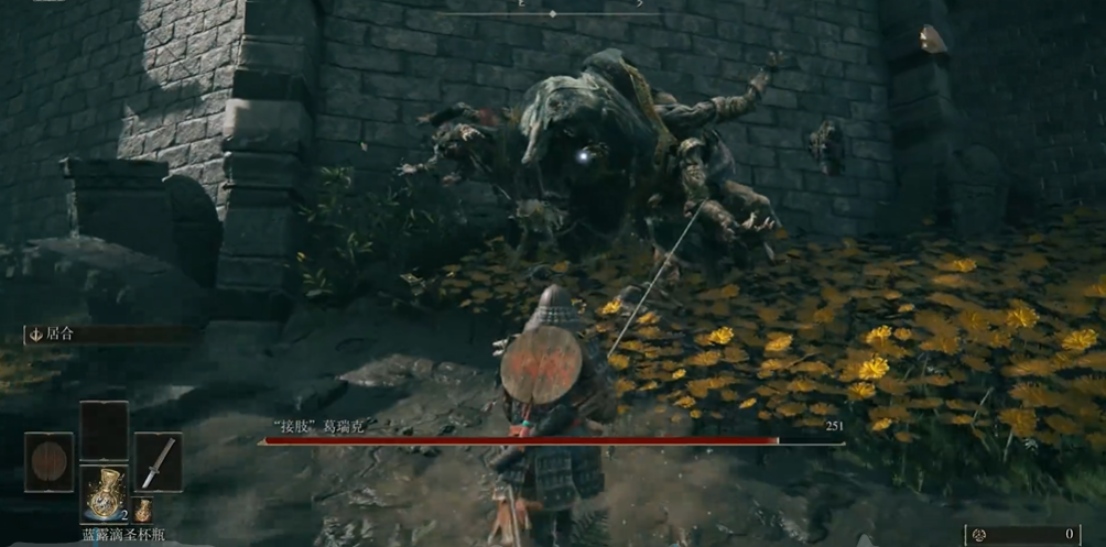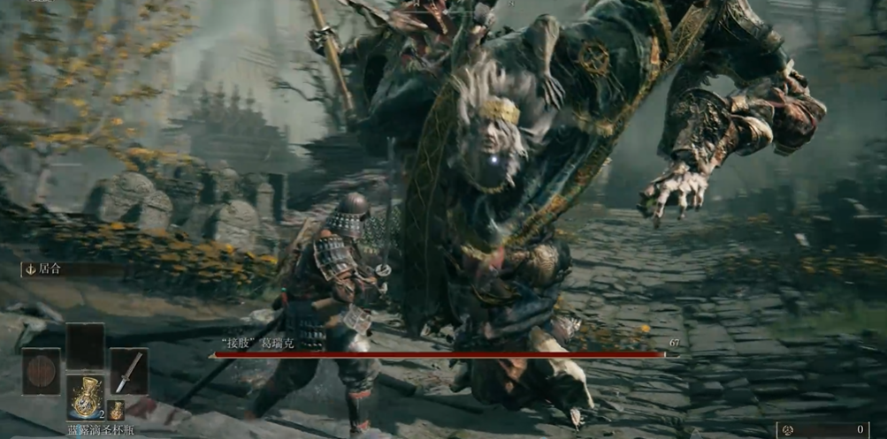 赐福点附近有一个升降机,乘坐升降机出来后进入一扇门,直走后会来到一片空旷的区域,这里可能有一条龙,玩家走近之后便会触发剧情,接肢葛瑞克随之出现并开始BOSS战。接肢葛瑞克的战斗分为两个阶段,一阶段他主要使用巨斧进行攻击,招式以大范围扇形横扫为主,因此不建议正面硬碰硬,最好是观察招式前摇,通过闪避翻滚到其侧身或身后进行蹭刀。